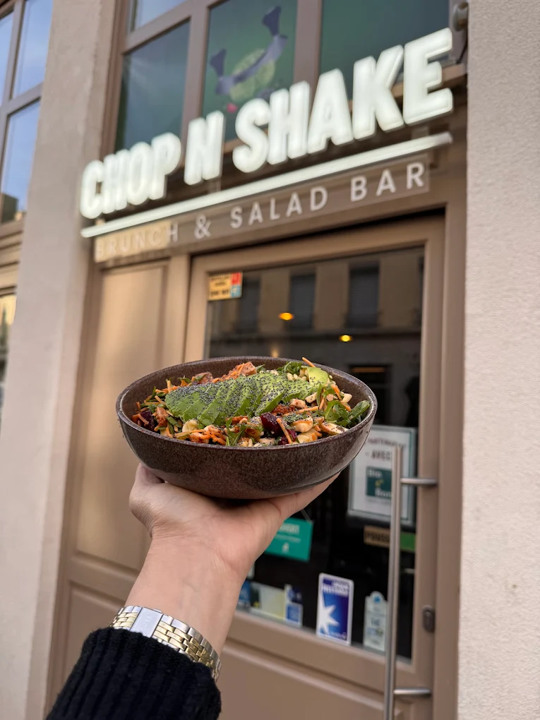 Chop N’Shake, situé dans le 3ᵉ arrondissement de Lyon, est un coffee-shop hybride entre bar à salades et brunch gourmand. Il propose des salades composées hachées minute, des toasts salés (avocat, ricotta, betterave…), des smoothie bowls, pancakes, crêpes mille trous, desserts maison et boissons chaudes/froides, le tout dans un cadre moderne et végétarien.
